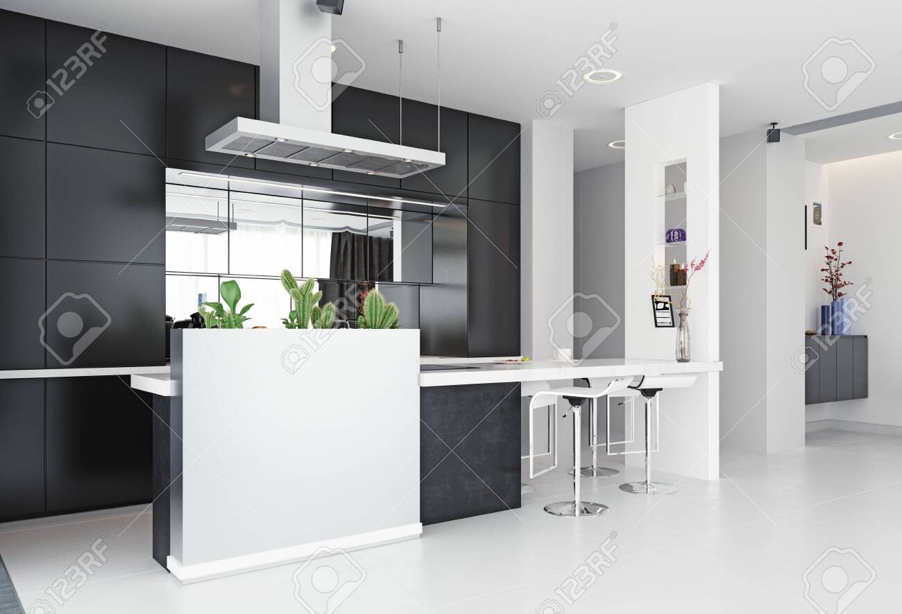 Modern Kitchen Black White Interior 3d Rendering Design Concept