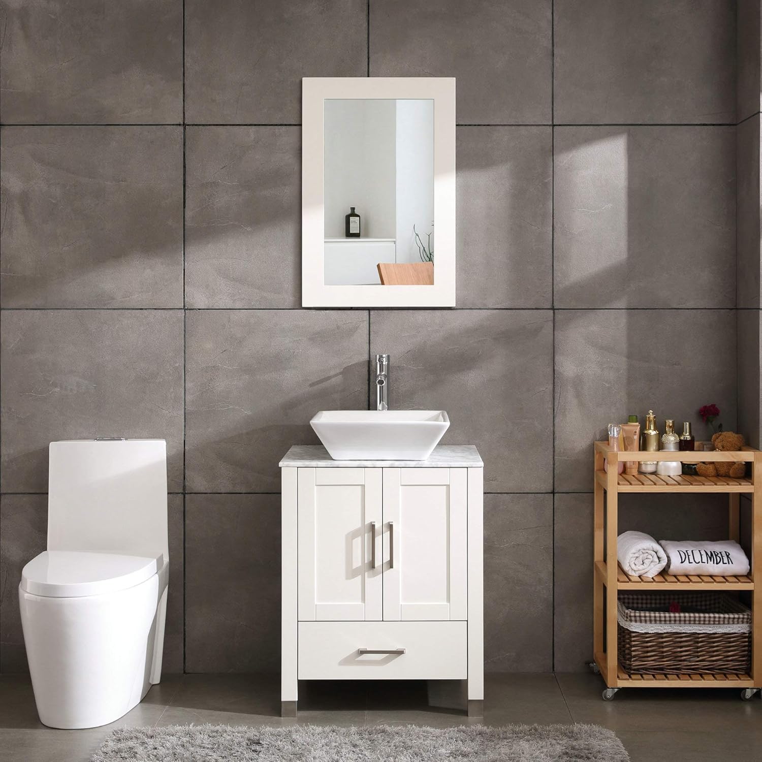 24 White Bathroom Vanity Cabinet And Sink Combo Modern Wood W Mirror Tempered Glass Marble Counter Top Solid Wood Marble Top