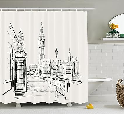 Ambesonne Modern Shower Curtain By London City With Big Ben Monument Scene In Sketch Style British Famous Town Artwork Fabric Bathroom Decor Set